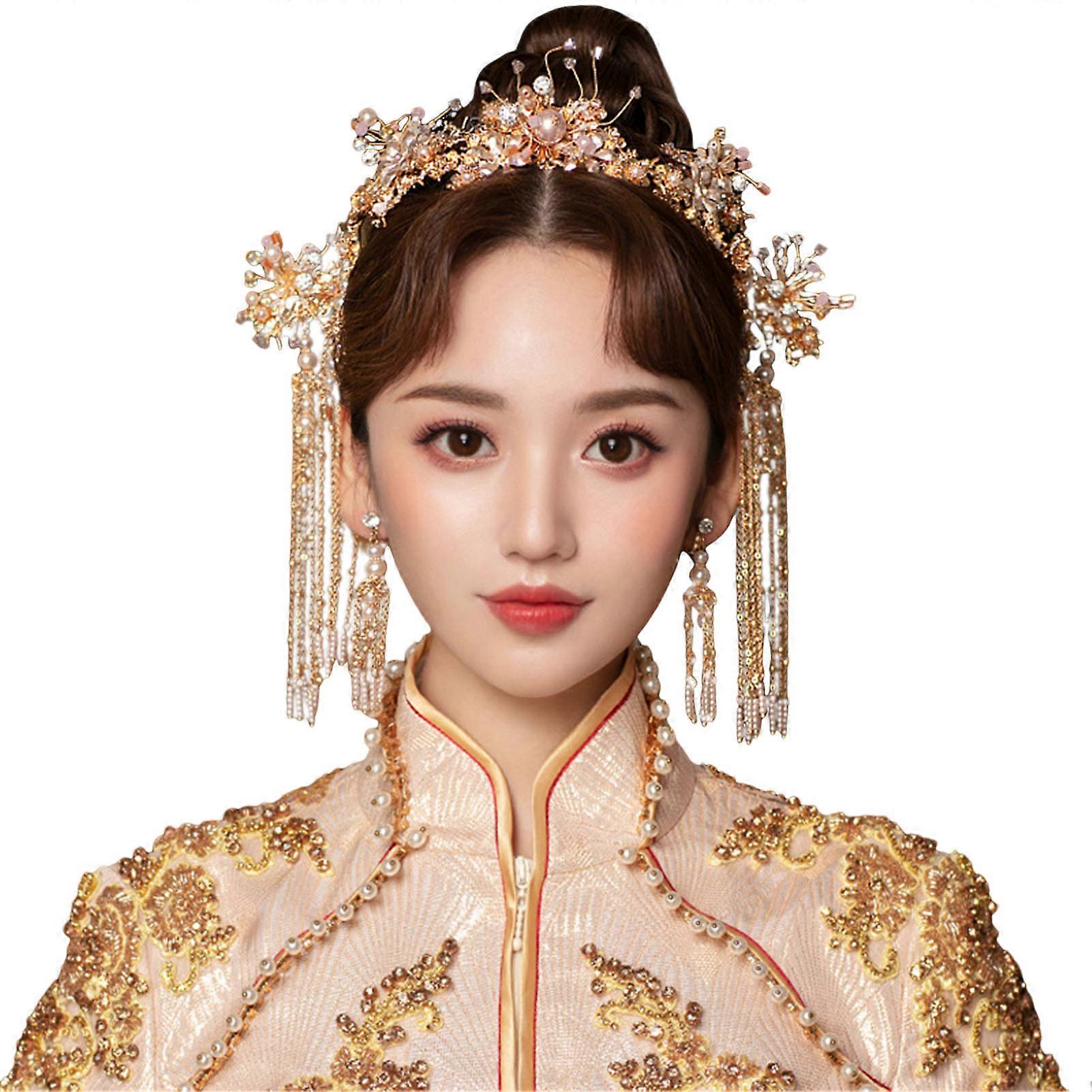 Features: Intricate Ancient Court Style: Embrace the elegance of ancient court style with a han chinese hair crown that exudes sophistication and grace, perfect for adding a touch of tradition to any outfit or occasion. Exquisite Craftsmanship: Handcrafted with attention to detail, this gold color metal headpiece features a pearl design and vintage charm, making it a timeless and elegant accessory that complements any hanfu ensemble. Versatile and Sparkling Tassel: The hanfu matching headpiece comes with a sparkling tassel that adds a touch of glamour to your look, making it ideal for festivals, weddings, parties, or any special event where you want to stand out. Elegant Retro Style: Elevate your hairstyle with this retro-style headpiece that exudes sophistication and charm, perfect for women looking to add a touch of vintage allures to their wedding attire or everyday look. DIY Hair Styling Essential: This headpiece is not just a beautiful accessory but also a practical hair styling tool that allows you to create unique and eye-catching hairstyles for any occasion, making it a must-have for diy enthusiasts and fashionistas alike. Specifications: Material: Alloy Style: Chinese Style Note: Due to the screen lighting effect, the actual color of the product may be slightly different. Due to manual measurement, please allow size error. Include: Choice1: 1 Set Headpiece (Ear Clip Type) OR Choice2: 1 Set Headpiece (Ear Hook Type)