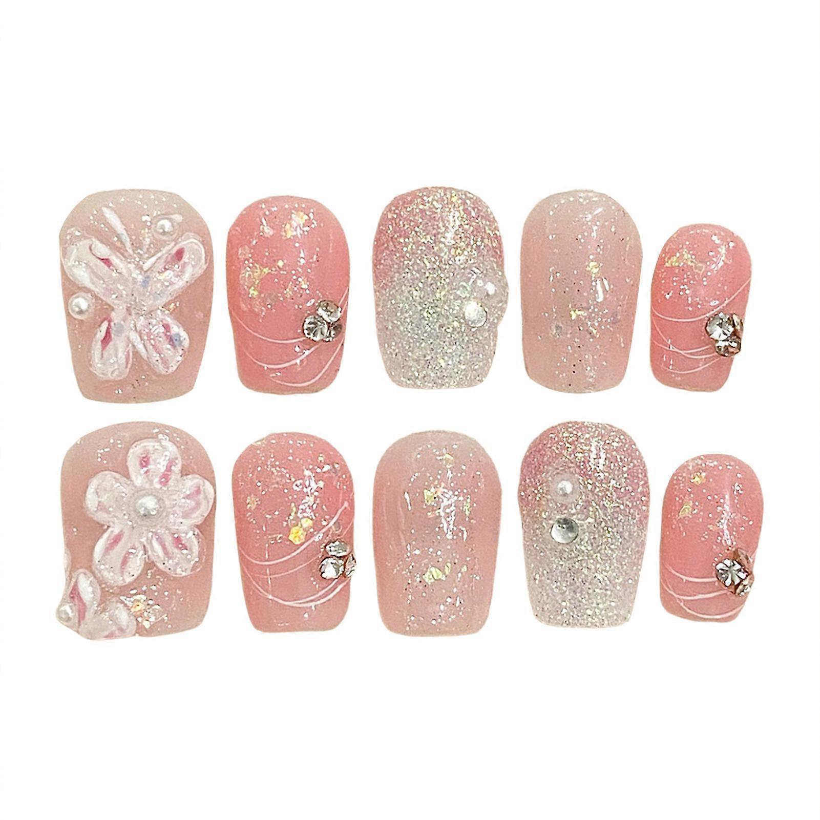 Features: French Round Press On Nails: Elevate your nail game with these chic french round press-on nails, adding a touch of sophistication to your look. Short Fake Press on Nails: Enjoy the convenience and style of short fake press-on nails, perfect for a quick and easy manicure on the go. Floral Pattern Handmade Wearable Fake Nails: Stand out with our handmade wearable fake nails featuring beautiful floral patterns, adding a touch of elegance to your nails. Durable Shiny Glitter Design Press On Nails: Our press-on nails boast a durable and shiny glitter design that will keep your nails looking glamorous and stylish for any occasion. Charming Comfortable to Wear Manicure Nails: Experience charm and comfort with our manicure nails that are not only stylish but also comfortable to wear all day long, perfect for hot girl dress matching or any occasion. Specifications: Material: Resin Size,Thumb(mm),Index Finger(mm),Middle Finger(mm),Ring Finger(mm),Little Finger(mm) XS,14,10,11,10,7 S,15,11,12,11,8 M,16,12,13,12,9 L,17,13,14,13,10 Note: Due to the screen lighting effect, the actual color of the product may be slightly different. Due to manual measurement, please allow size error. Include: 10*Fake Nails( With Jelly Gel and Nail File )