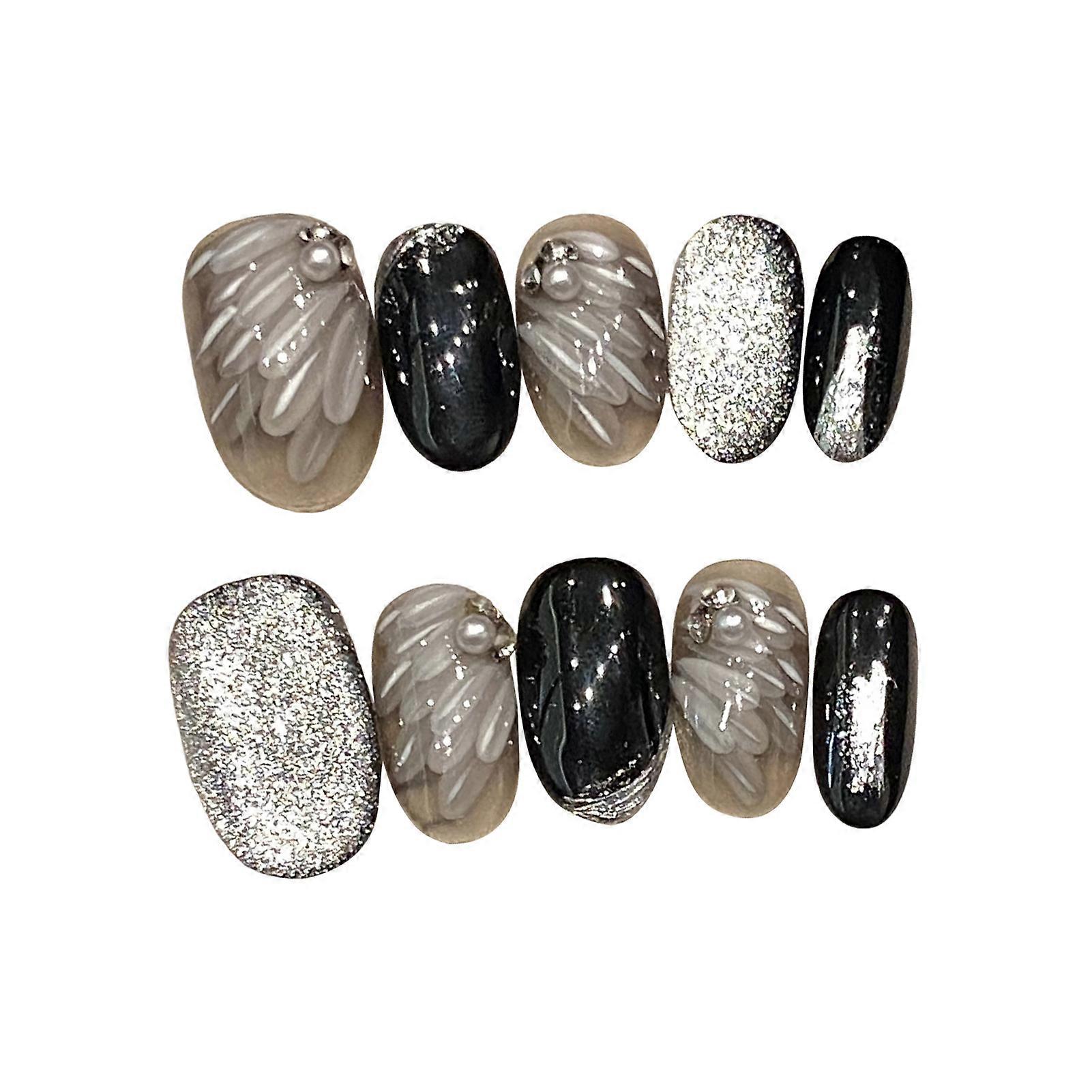 Features: Stylish Design: Our short round french glitter false nails feature a stunning rhinestone and pearl design, adding a touch of elegance to any manicure for women and girls. Easy Application: Enjoy the convenience of our Short Glitter Rhinestone Press on Nails. Simply press them on for an instant, salon-quality look without the hassle of traditional nail polish. Versatile Nail Art: Perfect for diy nail design art, these pearl decor round press on nails allow you to express your creativity at home or in a professional salon setting. Complete Nail Set: This set includes jelly gel and a nail file, providing everything you need for a complete at-home manicure experience, ensuring your nails look fabulous effortlessly. Perfect for Any Occasion: Whether it's a casual outing or a special event, our fairy plume pattern false nails are designed to elevate your style and make your nails the center of attention. Specifications: Material: Resin Size,Thumb,Index Finger,Middle Finger,The Fourth Finger,Little Finger XS,1.4cm,1cm,1.1cm,1cm,0.7cm S,1.5cm,1.1cm,1.2cm,1.1cm,0.8cm M,1.6cm,1.2cm,1.3cm,1.2cm,0.9cm L,1.7cm,1.3cm,1.4cm,1.3cm,1cm Note: Due to the screen lighting effect, the actual color of the product may be slightly different. Due to manual measurement, please allow size error. Include: 10*False Nails (with Jelly Gel and Nail File)