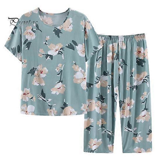 2 Pcs/Set Mid-aged Women Pajamas Set O Neck Flower Print Short Sleeve Elastic Waist Pleated Loose Thin Wide Leg Soft Mother Grandmother Sleepwear Top