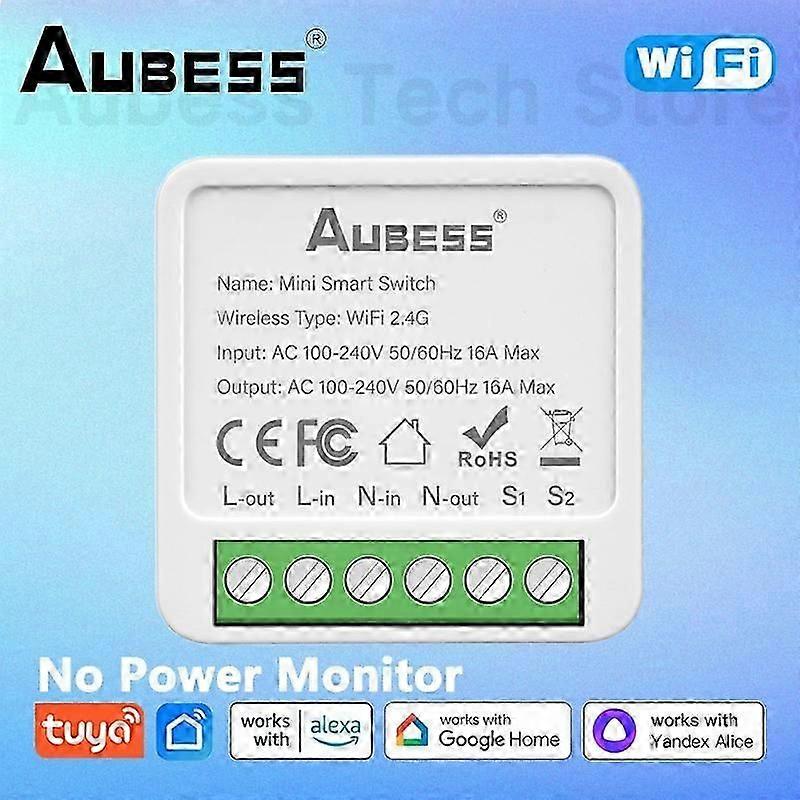 AUBESS MINI WiFi Smart Switch Tuya Smart Home Support 2 Way Control, Voice Control Compatible With Alice Alexa Google Assistant Description: 1. Refit ordinary non-smart appliances or equipment into smart devices. Such as refitting a desk lamp into a smart desk lamp, and the mobile phone can control the switch of the light. To turn the downlight into a smart downlight, you only need to connect a smart switch module to the switch, and then Alexa/Google assistant can control the light switch. 2. Mobile APP control. Control the device's power on and off, timing, countdown and other functions through the mobile phone. As long as the mobile phone has a network, the switch module at home can be controlled globally. 3. Voice control. Support voice assistants such as Tmall Genie, Alexa, Google Home, and realize functions such as switches; "Alexa, turn on the kitchen lights." You can turn on the lights in one sentence and enjoy a convenient smart life. 4. Timing. You can control the switch, timing, countdown and other functions of the device through your mobile phone. This can be ordered: turn off the lights in the living room after 2 hours. 18:15 Turn off the oven. Turn on the boiler at 21:00. You can also time the device when you are not at home. (APP: Smart Life/TUYA Smart) 5. Group control. The lights can be grouped to achieve unified control (simultaneous switching, timing, etc.); 6. The Internet of Everything. Through settings, it can be linked with other smart scenes to make life smarter; for example, set the home scene: automatically turn on the living room lights, TV, and air conditioner. 7. Sharing and security. The main account can be shared with other family members, and the functions and settings are completely retained and copied; security: once the main account adds a light, the light will be hidden and other users can no longer find and add; it needs to be actively shared before others can use it it. 8.State memory. Resume the power after the power failure, without worrying about the change of the equipment state, and maintain the state before the power failure. It was in the open state before the power was cut off, and the open state is automatically restored when the power is turned on again. (Can be set to open, close, power off memory mode) 9. Three wiring methods.(2-way/1-way/non switch) Can be directly connected to the device without connecting a swi