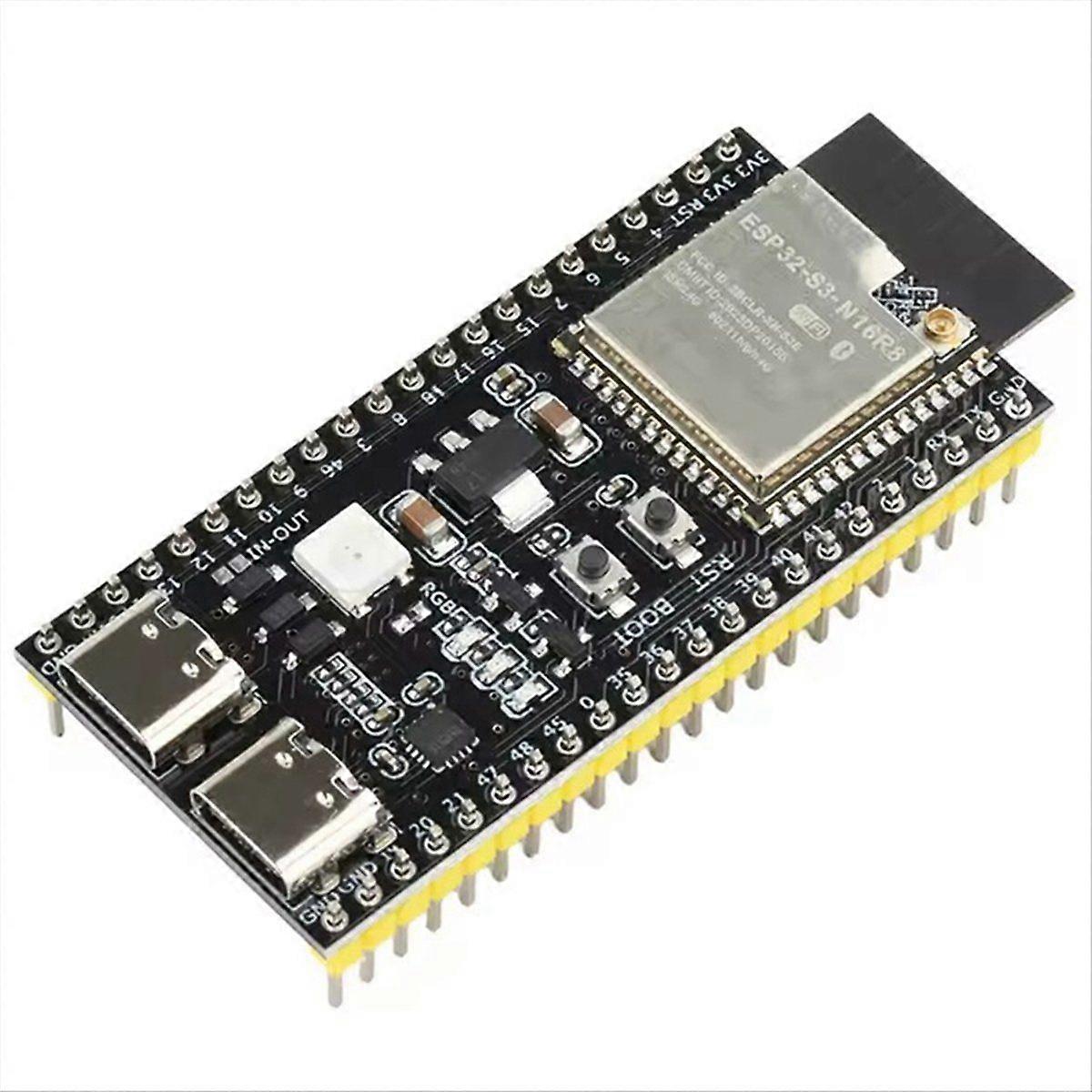 Hign-concerned Chemical: NoneSize: As DescriiptionType: As DescriiptionModel Number: As Descriiption; : ElectricalFeatures: 1. High-performance dual-core processor: integrated 32-bit LX7 dual-core processor, providing powerful computing power and low power performance. 2. Wi-Fi and Bluetooth dual-mode support: supports 2.4GHz Wi-Fi and BT 5 (BLE), compatible with a variety of wireless communication protocols. 3. Efficient data transmission: data rate up to 150 Mbps, ensuring fast and stable connection.4. Multiple interfaces: with two Type-C interfaces, one can be used directly with COM mark, and the other USB can use OTG or BOOT to power on to display the port normally and download the program.5. Low power consumption and high power mode: with low power coprocessor and high power mode up to 20 dBm, it can adapt to the needs of various application scenarios.Product introduction:This product is a development board based on the ESP32-S3-WROOM-1 module, with more IO ports, onboard WS2818RGB, corresponding to IO48. With two Type-C interfaces, one can be used directly with COM mark, and the other USB can use OTG or BOOT to power on to display the port normally and download the program. The factory program is that RGB automatically lights up after connecting to WiFi and turns off after disconnecting.Product parameters:Working voltage: 3.3~5VIO port: 36 IOsFlash: N16R8 (16M), N8R2 (8M)PSRAM: N16R8 (8M), N8R2 (2M)2 , 4 SPI interfacesSize: 57mm*28mmColor: As ShownMaterial: PCB Package Contents:1*ESP32-S3 Development Board Only the above package content, other products are not included.Note: Light reflection and different displays may cause the color of the item in the picture a little different from the real thing. The measurement allowed error is +/- 1-3cm.