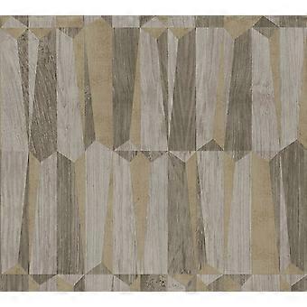 Hout behang Profhome 387433-GU vliesbehang hardvinyl warmdruk in reliëf licht gestructureerd in hout look glanzend bruin goud grijs 5,33 m2