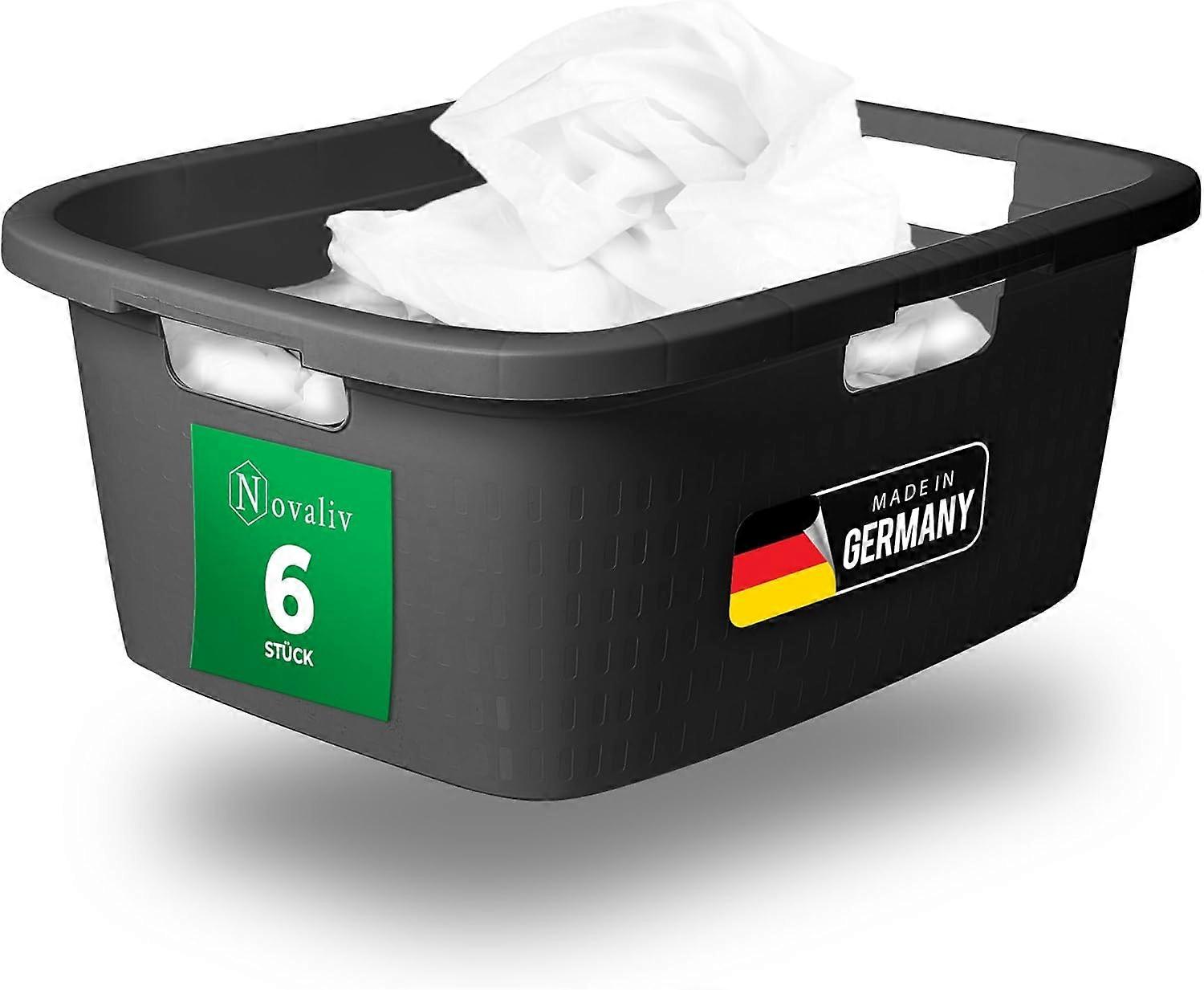 ? ELEGANT: Der Novaliv Wäschekorb in stilvoller Optik überzeugt durch sein dezentes Design, das sich harmonisch in Badezimmer, Schlafzimmer oder Waschkeller einfügt. Die 3 Griffe sorgen für komfortables Tragen im ganzen Haus.? GROßES VOLUMEN: Mit einem Volumen von 25 Litern bietet die Wäschewanne genügend Platz für die Schmutzwäsche der ganzen Familie. Ideal für Haushalte, die Wert auf eine praktische und platzsparende Aufbewahrungslösung legen. Maße: 55x40x23 cm? MADE IN GERMANY: Der in Deutschland gefertigte Wäschebehälter steht für Qualität, Langlebigkeit und umweltbewusste Produktion. Kurze Transportwege und die Verwendung hochwertiger Materialien machen ihn zu einer umweltbewussten Wahl für Ihr Zuhause.? VIELSEITIG: Unsere Wanne ist nicht nur für Schmutzwäsche geeignet, sondern auch vielseitig nutzbar: ideal zur Aufbewahrung von Pfandflaschen, Spielzeug, Schuhen, Gartenutensilien, Reinigungszubehör oder als praktischer Helfer beim Camping und im Büro.? HOCHWERTIG: Gefertigt aus strapazierfähigem Kunststoff, ist der Wäschesammler feuchtigkeitsbeständig, leicht zu reinigen und für den Einsatz in Badezimmern oder im Außenbereich geeignet. Perfekt für den täglichen Gebrauch und besonders langlebig.