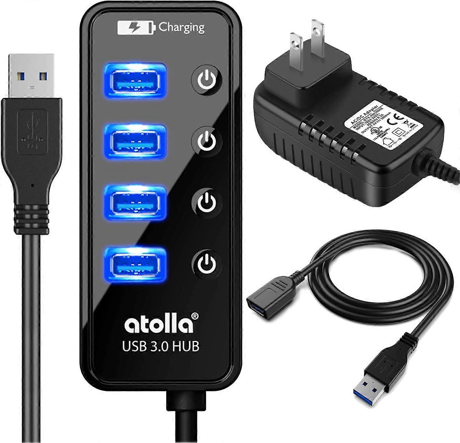 Powered USB Hub Long Cord, USB 3.0 Hub 4 + 1 Data Transfer and Charging Multiport with Power Supply Adapter 15W