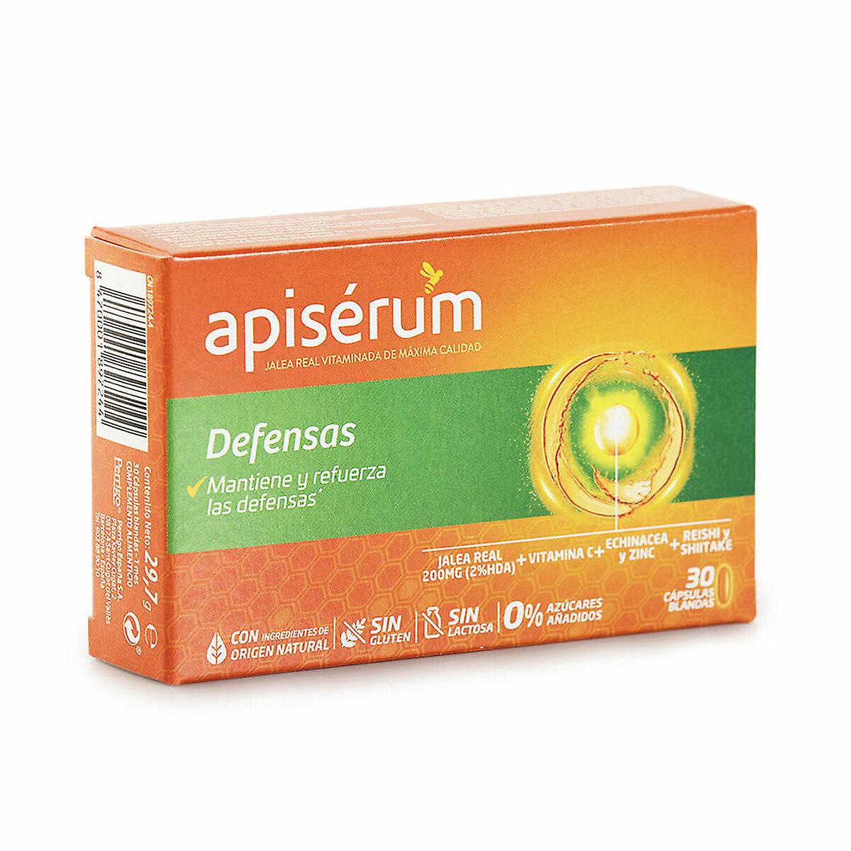 we present the Food Supplement Apiserum 3534 (30 uds) The dietary supplement APISÉRUM DEFENSAS model 3534 is specially formulated to support the natural functions of the immune system in adults, both men and women, thanks to its balanced combination of active ingredients. Presented in a 30-capsule container, this supplement includes vitamin C and zinc, two essential nutrients known for their antioxidant properties and their ability to strengthen the body’s defenses against external agents. It also contains extracts of medicinal mushrooms such as shiitake and reishi, valued in phytotherapy for their contribution to immunomodulation and their adaptogenic effect that helps maintain body balance in stressful situations. The formula is complemented by echinacea, a plant traditionally used to stimulate immune response and reduce the duration of colds or respiratory conditions. The product comes in a convenient and practical format, with easy-to-swallow capsules and a mild honey flavor, designed to facilitate regular consumption. Manufactured in Spain and packaged in a lightweight plastic container weighing approximately 0.5 kg, this supplement meets the basic needs of adults seeking additional support alongside a balanced diet. Its composition and dosage are designed for regular use, helping to safely and effectively boost the body’s natural defenses. In short, APISÉRUM DEFENSAS positions itself as a natural and functional alternative for daily immune support. Gender: UnisexIngredients: Vitamin CZincShitakeEchinaceaReishiType: ParapharmacyFood SupplementUnits: 30 Units