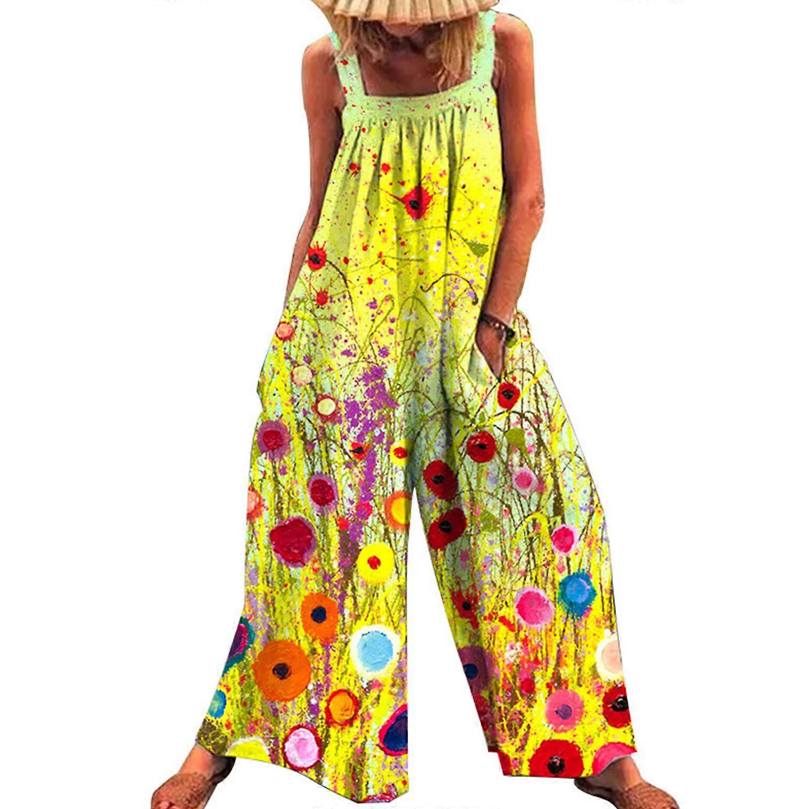 Women Summer Sleeveless Wide Leg Long Pants Jumpsuit Boho Floral Print Casual Loose for Tank Top Rompers Playsuit Beachwear with Pockets Streetwear